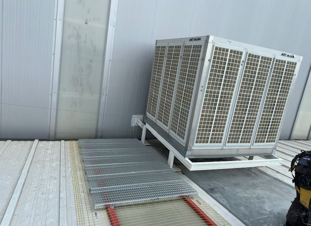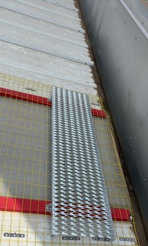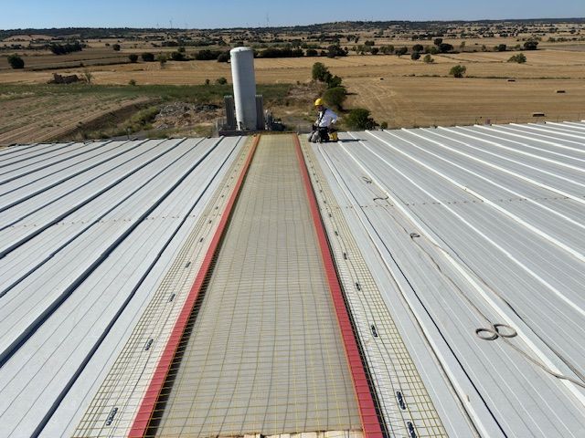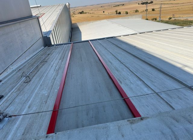 Una vez tenems lineas de vida, mallas de protección anticaidas en lucernarios, instalamos pasarelas para poder transitar por encima de los lucernarios para realizar mantenimientos oportunnos en cubierta.